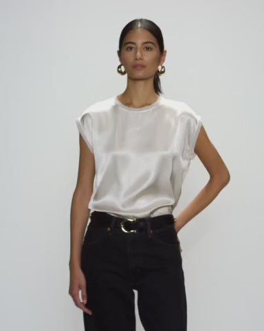 The Helen Top shines with smooth, unfussy allure—crafted from hammered satin in a boxy, cropped fit that commands attention without trying too hard. Raw edges and a sleeveless crew neckline meet a button-back keyhole closure for a look that’s effortlessly striking.
