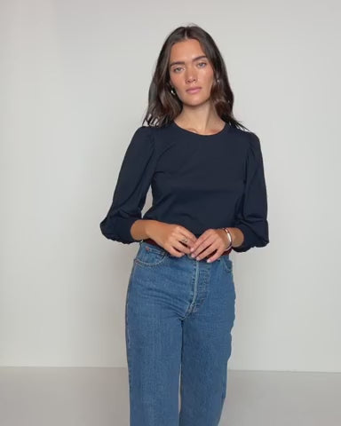 The ease of a comfortable, cotton tee meets the look of a fancy blouse. An exaggerated shoulder, volume in the 3/4 length sleeve, and smocking around the cuff create a delightfully feminine look. It's Nation's best seller for a reason. This one comes in Navy Night Sky.